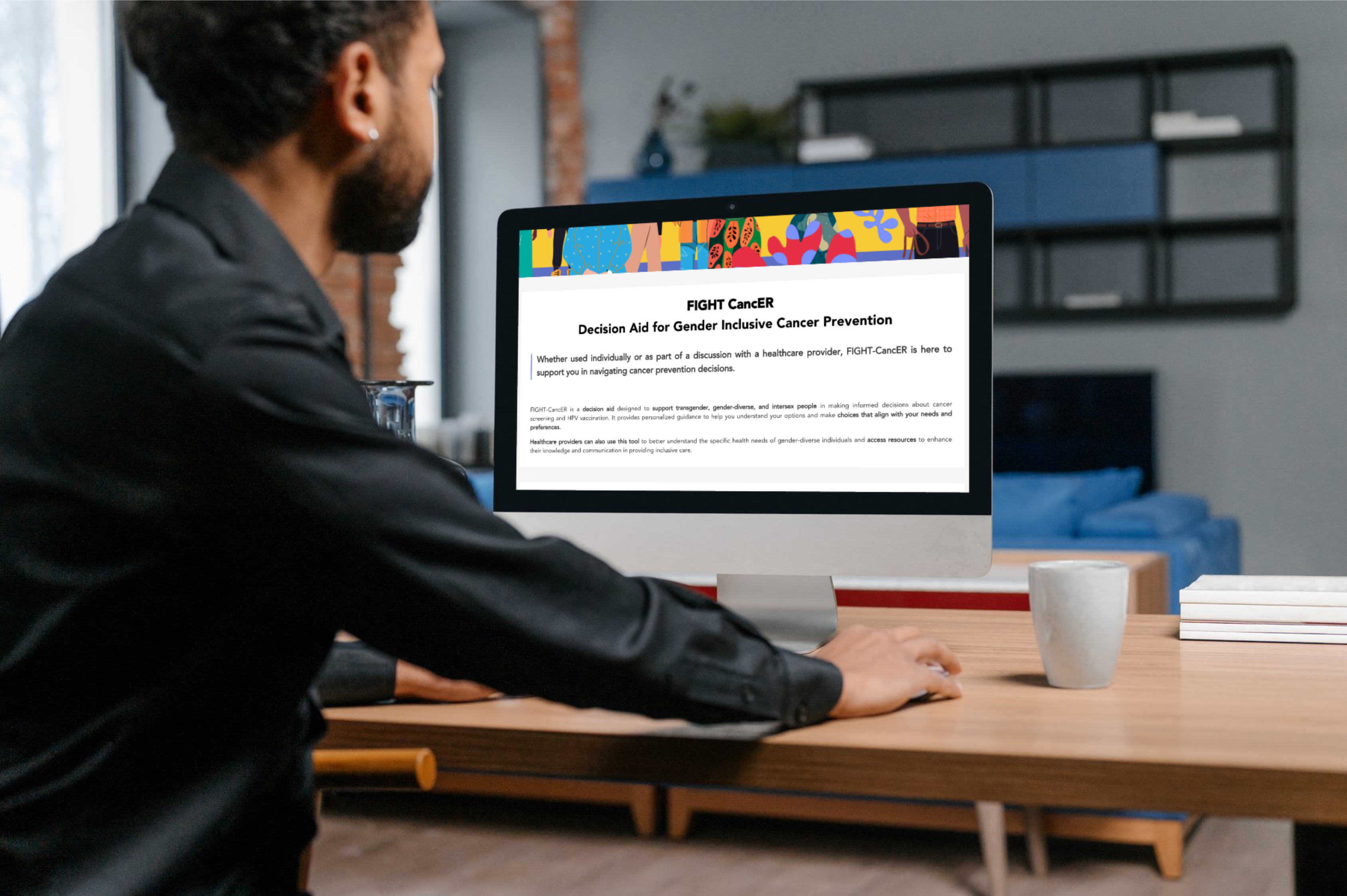 FIGHT-CancER is a decision aid designed to support transgender, gender-diverse, and intersex people in making informed decisions about cancer screening and HPV vaccination. It provides personalized guidance to help you understand your options and make choices that align with your needs and preferences.